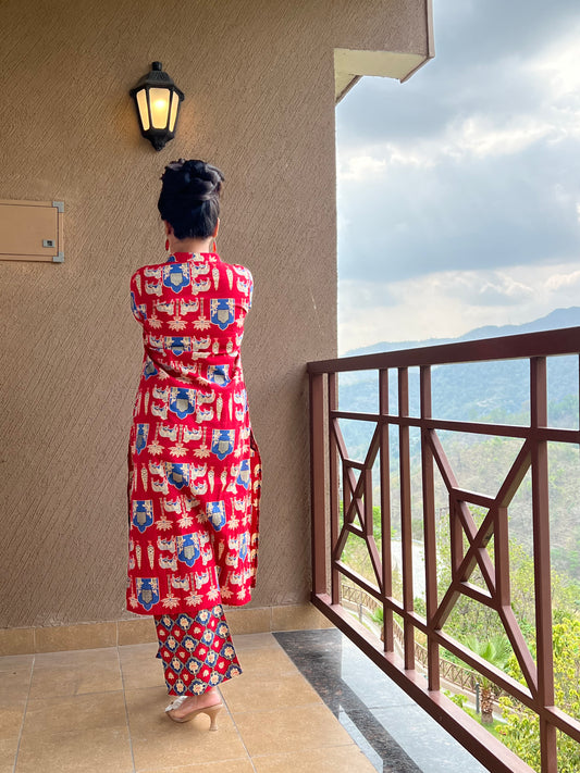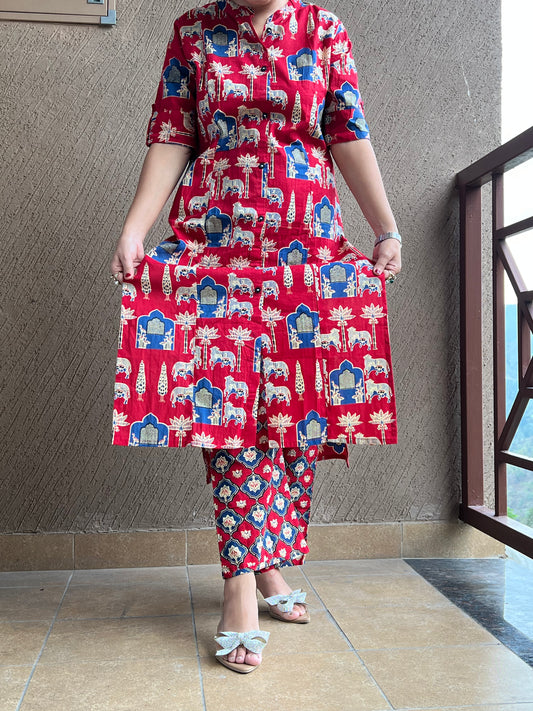 Red Ethnic Print Long Co-ord set in Cotton with Pockets– Riva Scarlet