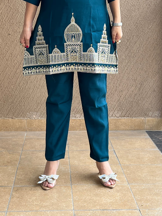 Teal Zari Embroidered Co-ord Set in Cotton Silk – Aarya Teal