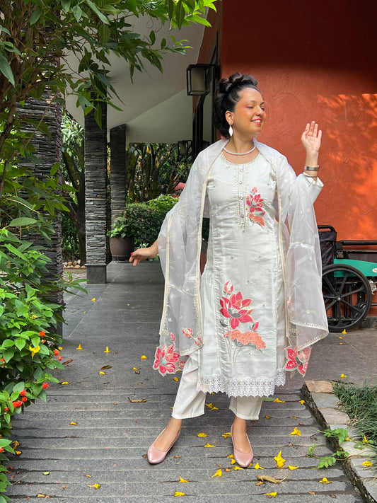 Ivory Embroidered Kurta Set with Organza Dupatta – Meher